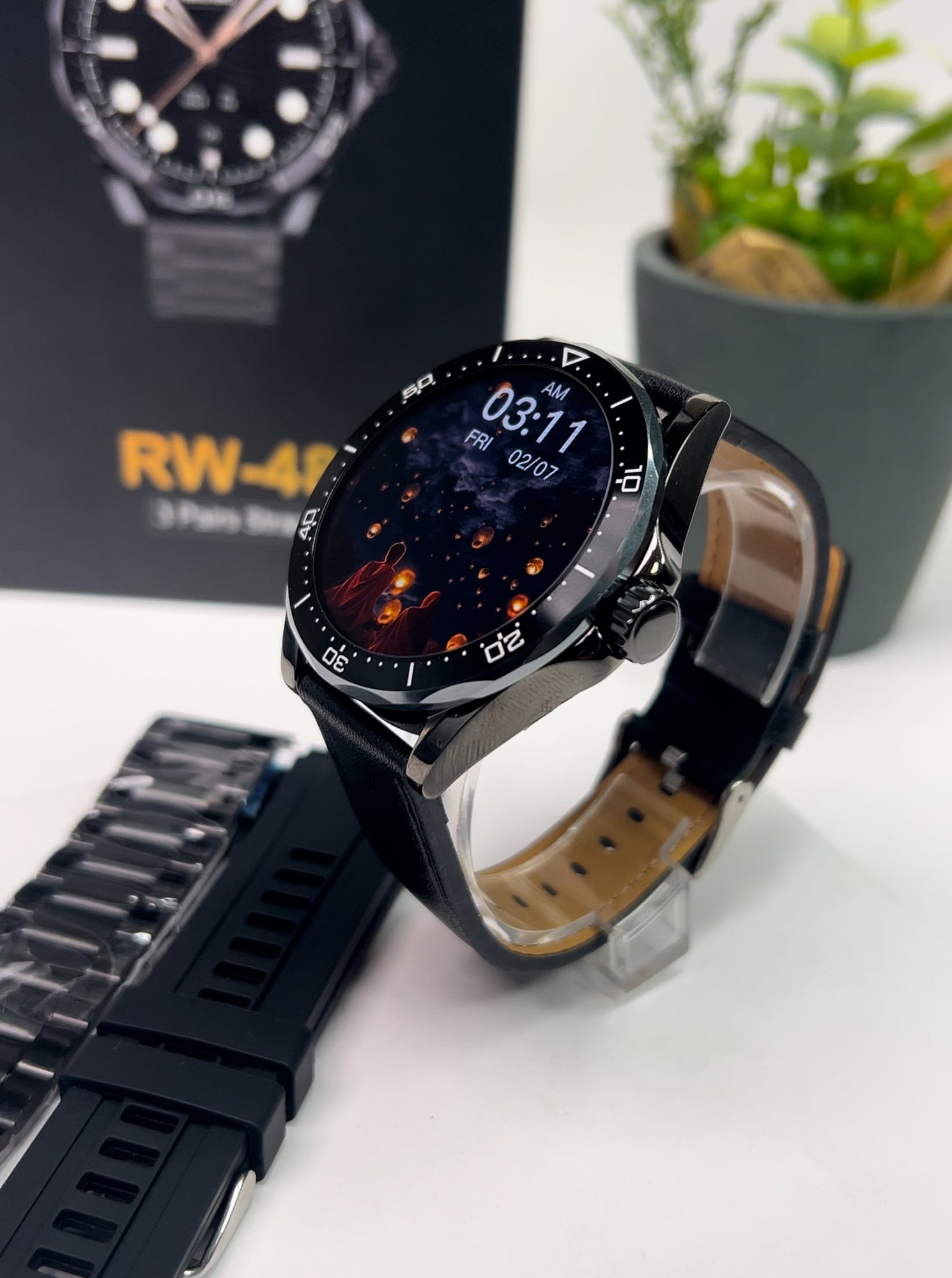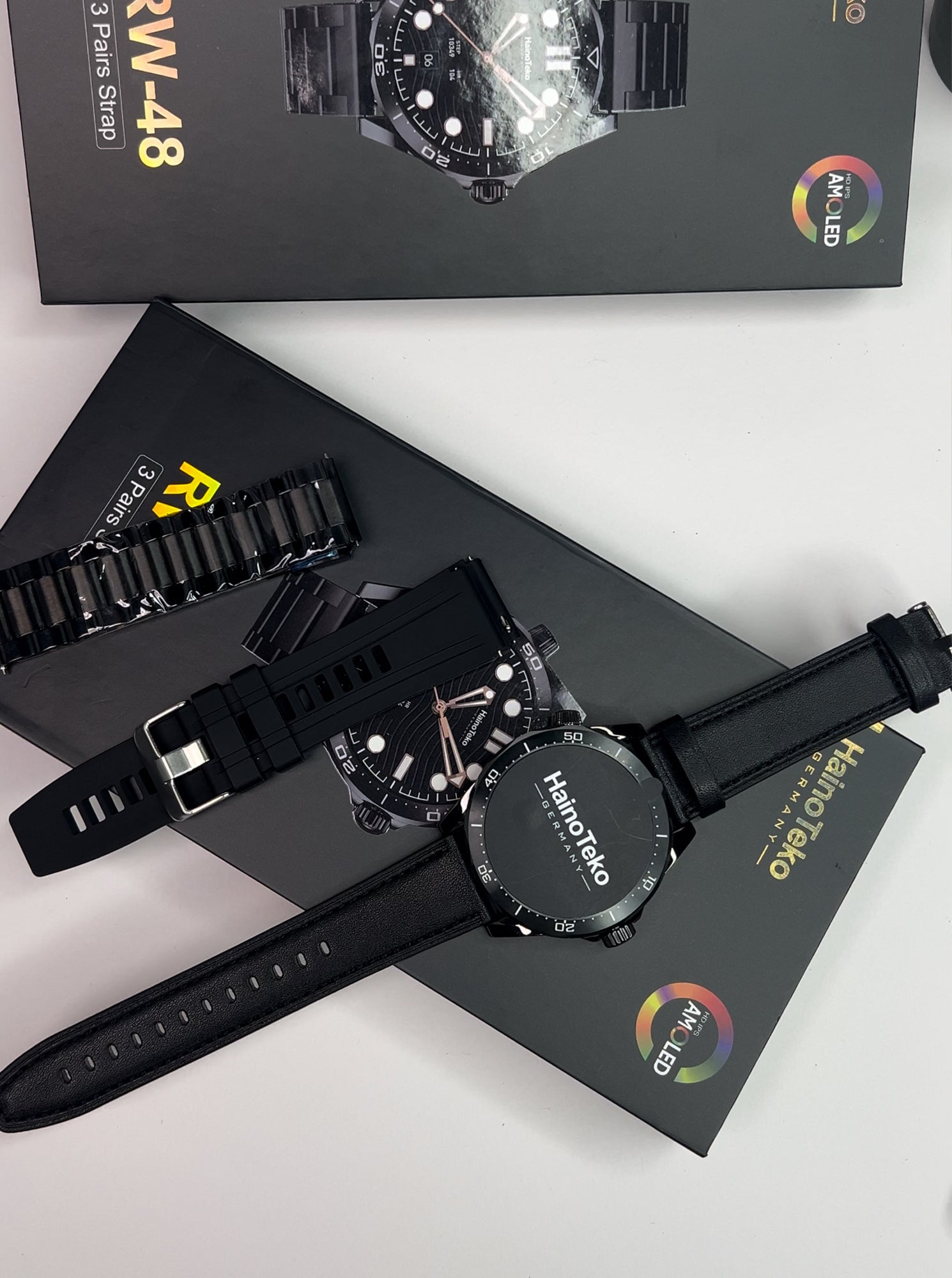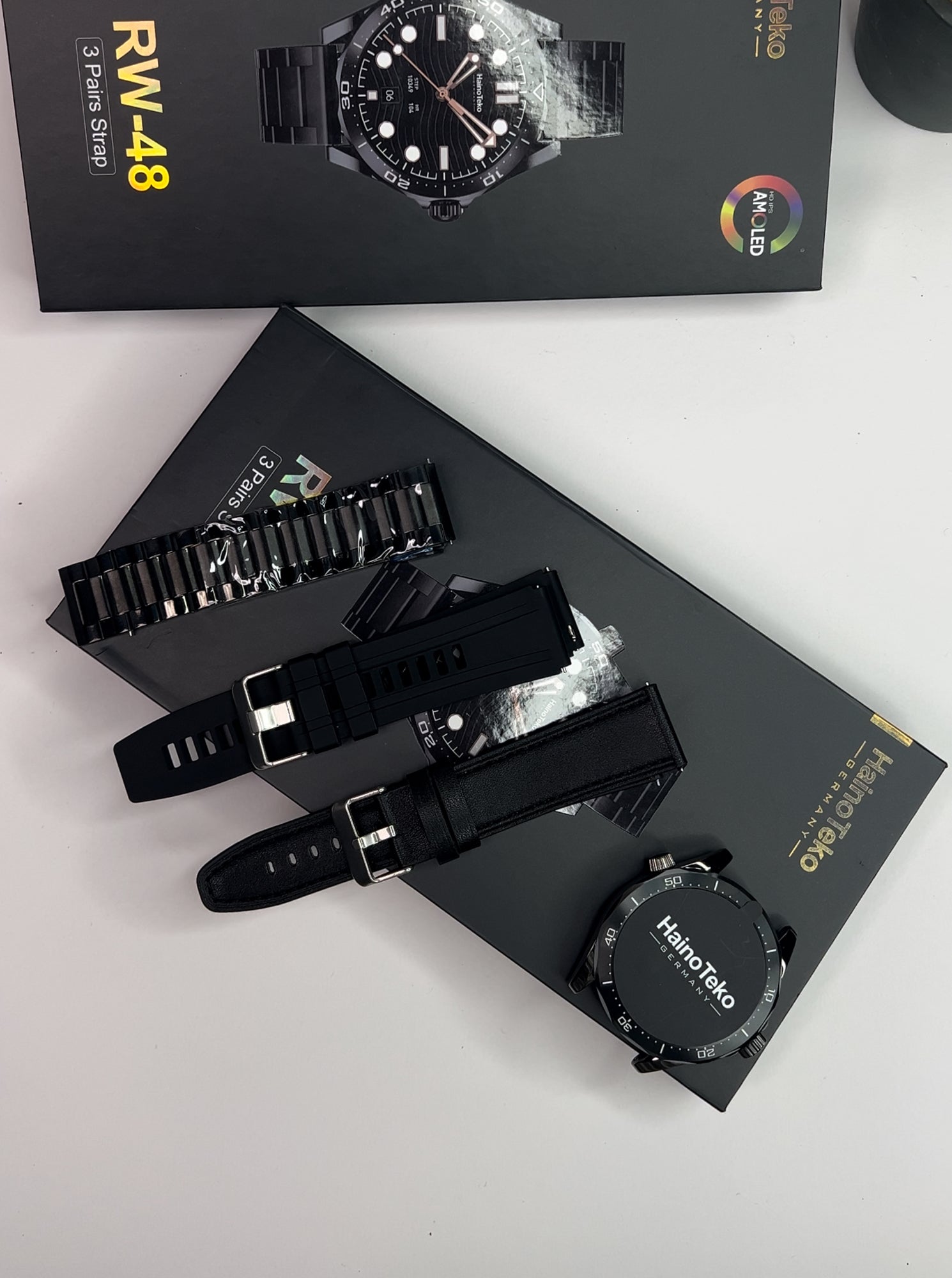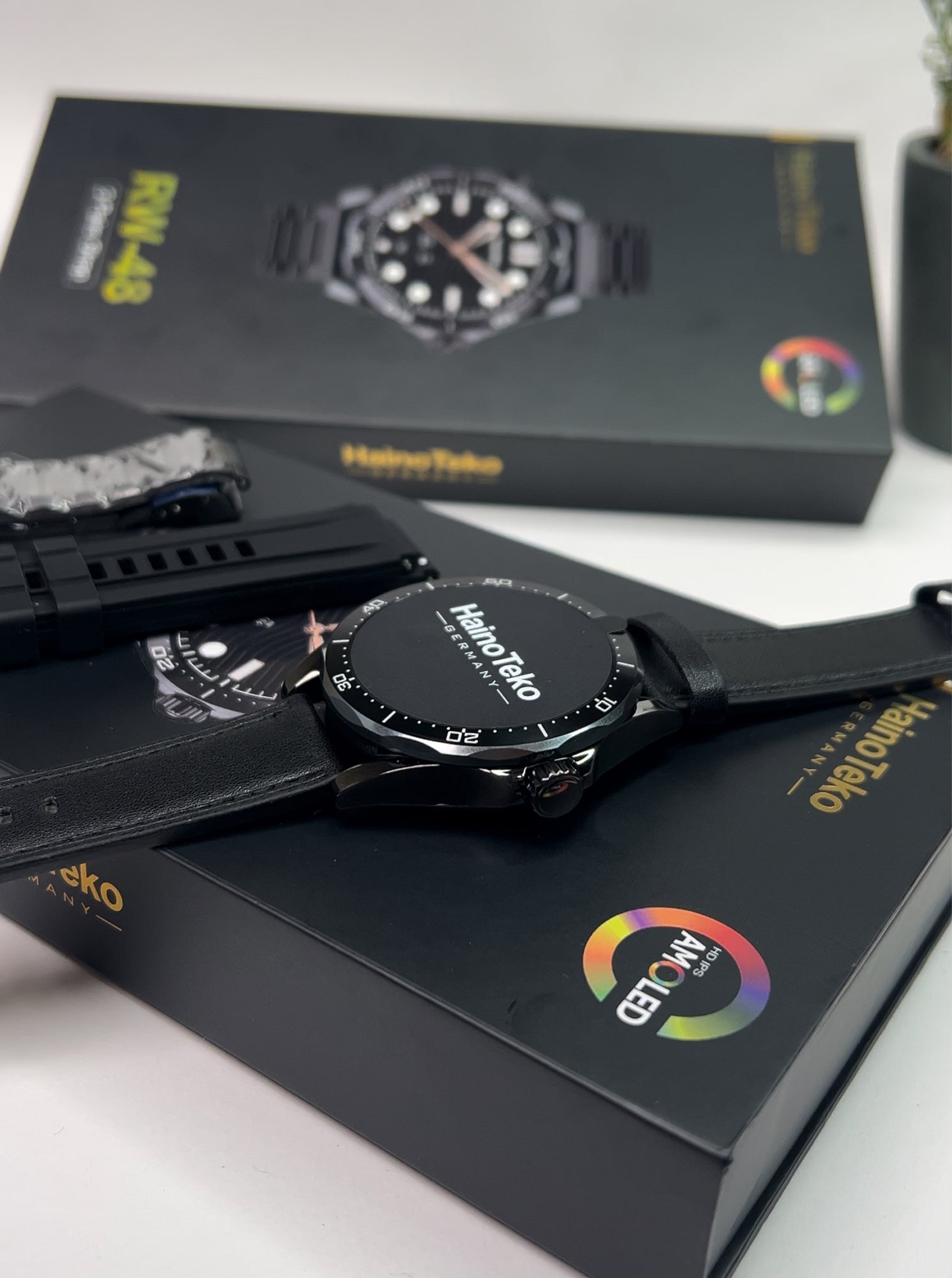 Introducing the Haino Teko RW 48 Smartwatch, the ultimate wearable technology that combines style and functionality. This smartwatch features a high-quality AMOLED screen that delivers stunning visuals and a smooth user interface. With its vibrant colors and high contrast, you'll never miss a notification or important information again.ย But what sets the Haino Teko RW 48 apart are its 3 pairs of interchangeable straps โ metal, silicone, and leather โ allowing you to customize your look to match any occasion. Whether you're hitting the gym, attending a business meeting, or going out for a night on the town, this smartwatch has got you covered.ย No more tangled cords or searching for outlets, the Haino Teko RW 48 comes with a magnetic wireless charger that ensures quick and hassle-free charging. Simply place your watch on the charger and let the magnetic connection do the rest. Say goodbye to the days of fumbling with cords and hello to the convenience of wireless charging.ย But the Haino Teko RW 48 is not just a pretty face, it also delivers high-definition calls for crystal-clear communication. You can answer and make calls directly from your watch without having to reach for your phone. With its quick and smooth control, you can easily navigate through notifications, messages, and other features with just a tap or a swipe.ย Don't settle for a basic smartwatch, upgrade to the Haino Teko RW 48 and elevate your style and convenience game. With its high-quality AMOLED screen, 3 pairs of interchangeable straps, magnetic wireless charger, and support for HD calls, this smartwatch is a must-have for any tech-savvy individual. Upgrade to the Haino Teko RW 48 and experience the perfect blend of fashion and technology. Get yours today!